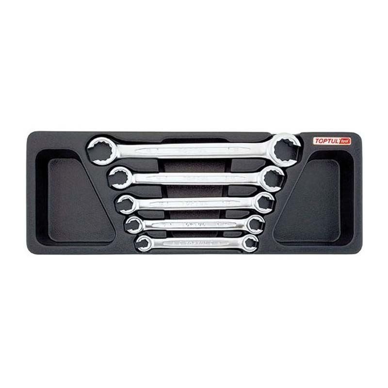 ست آچار دو سر چاکدار TOPTUL GAAT0502 شامل ۵ آچار با سایزهای ۸×۹ تا ۱۹×۲۲ میلیمتر است که برای مهرههای Flare طراحی شدهاند. این آچارها از کروم‑وانادیوم با روکش ساتن کروم ساخته شدهاند تا دوام بالا و مقاومت در برابر زنگ داشته باشند. طراحی چاکدار و ضخیم سر آچار، گریپ قوی و ایمن روی مهرههای حساس را تضمین میکند. بستهبندی ماژولار آنها نیز امکان نظمدهی و حمل آسان را فراهم میآورد.